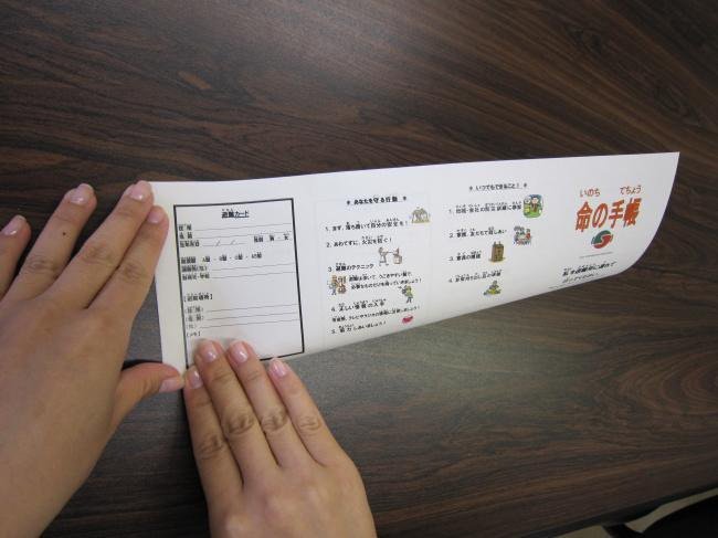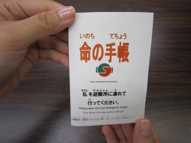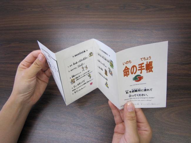 この手帳は、より多くの外国籍市民の方に災害時の心得等を知っていただくため、外国人登録証と一緒に常に携帯できるよう作成されました。「命の手帳」は自由に印刷し、蛇腹式に折りたたんで、携帯していただくようになっています。 また、裏面の「避難カード」は実際に災害が起きたときに日本人や日本語のわかる人に見てもらうことで、より安全な救助及び避難行動ができるよう日本語で記入するようにしてください。