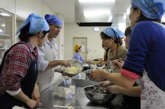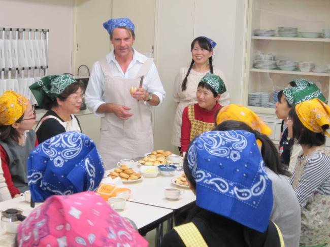 「このスコーンの作り方はとても簡単だから僕のように不器用な人でもできます(笑)。」と、参加者の皆さんもリラックスして講座をスタート。ウェインさんはやさしい英語と覚えたての日本語を駆使しながら参加者とコミュニケーションを取っていました。焼きあがったスコーンは温かいうちにバターとジャムをつけていただきました。焼き上がりのスコーンとバターの良い香りにあふれた会場でした。