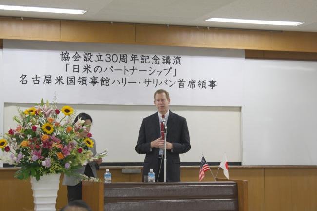 総会と協会設立30周年記念講演を開催しました。 2012年05月31日(木) とき: 2012年5月25日(金)午後3時~4時50分 ところ: 安城市民会館 大会議室 名古屋米国領事館ハリー・サリバン首席領事による講演を総会終了後に開催しました。 本協会設立30周年を迎える本年度は、アメリカ姉妹都市ハンティントンビーチ市との姉妹都市提携30周年でもあり、サリバン首席領事から、アメリカ人から見た日本の印象、日米パートナーシップの重要性と、東日本大震災の復興を支援した「トモダチ作戦」についてお話しいただきました。 【レポート:事務局】 公開日:2012年05月31日