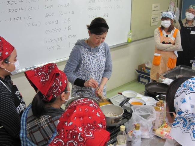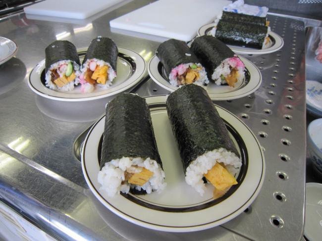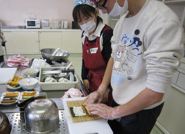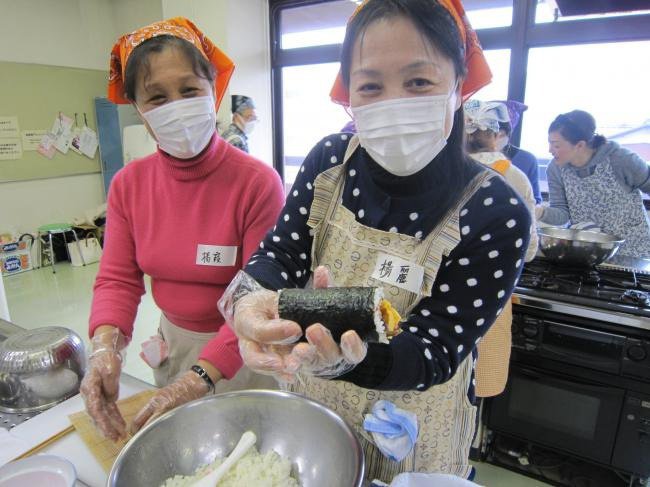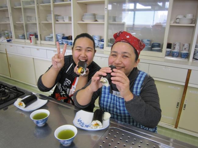 今回のメニューは「恵方巻」(巻き寿司)。縁起が良いとされる7種類の具材を使い、伝統的な恵方巻を作りました。参加者は慣れない手つきながらも一生懸命!完成した恵方巻は大きさも形もそれぞれでしたが、食べるときは全員笑顔で丸かぶりしました。